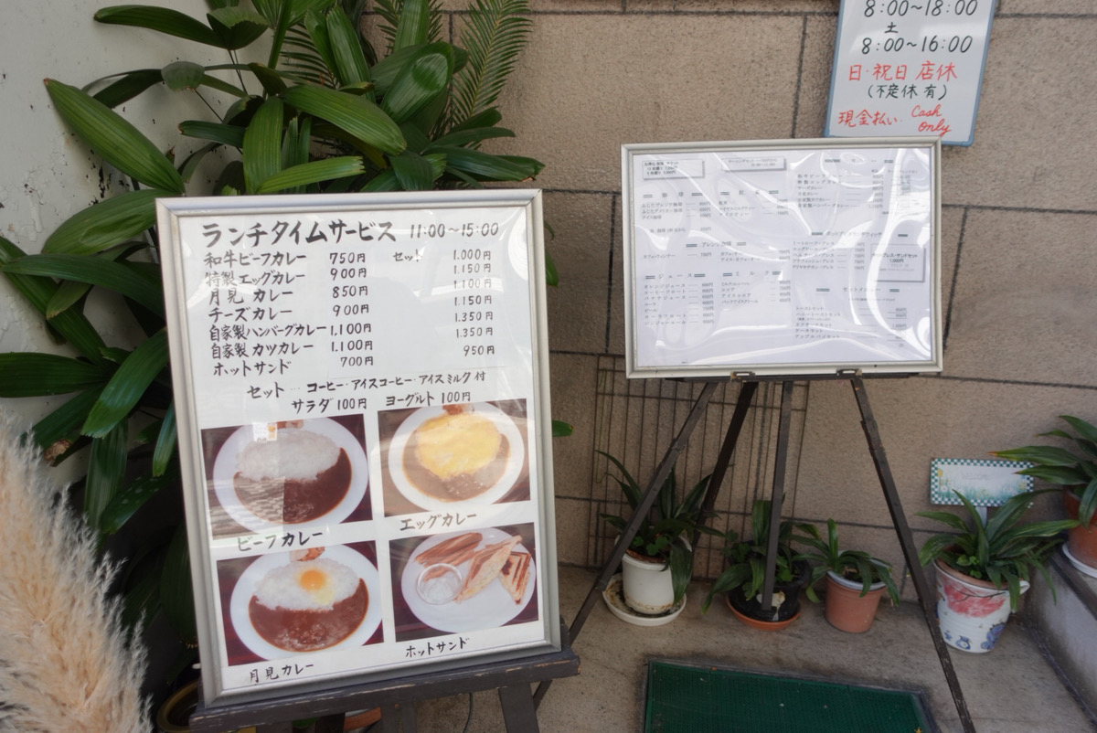 ランチタイムは、主に「各種カレー」と「ホットサンド」が提供され、それにアフター珈琲をつけることができる。