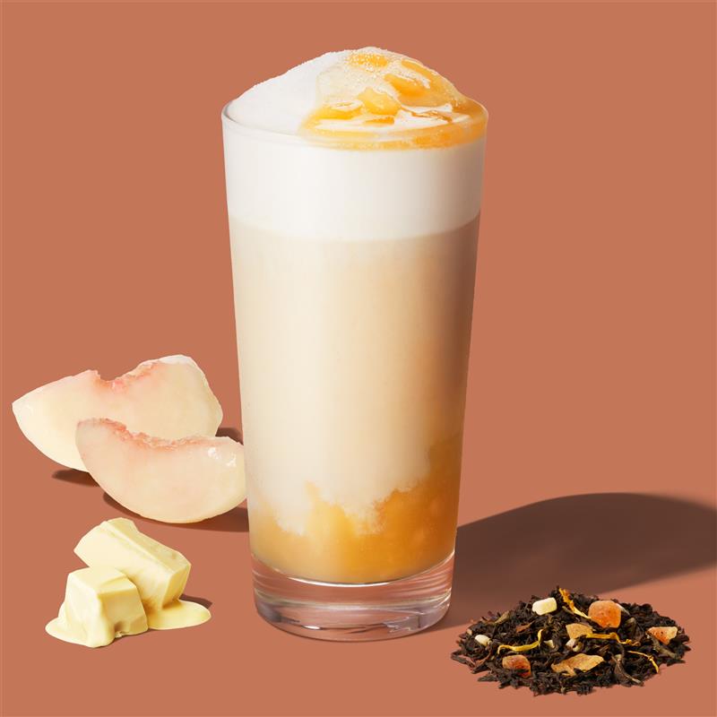 「ジョイフルメドレー」とホワイトピーチのフレーバーシロップ、ミルクを合わせたフルーティーなティーベースに、ホワイトピーチ果肉ソースを加え、ティームースとホワイトチョコレートパウダーで仕上げた特別な一杯。