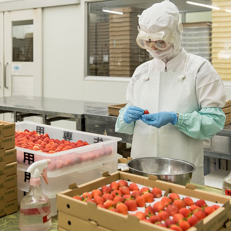 「いちご大福」という言葉がまだ珍しかった昭和61年、現社長の祖母・フミヱさんの「白あんでいちごを包んだらもっとおいしいと思うよ」という一言から誕生した如水庵のいちご大福。試作を重ね、いちご・白あん・お餅の絶妙なバランスを追求し、理想の形にたどり着きました。