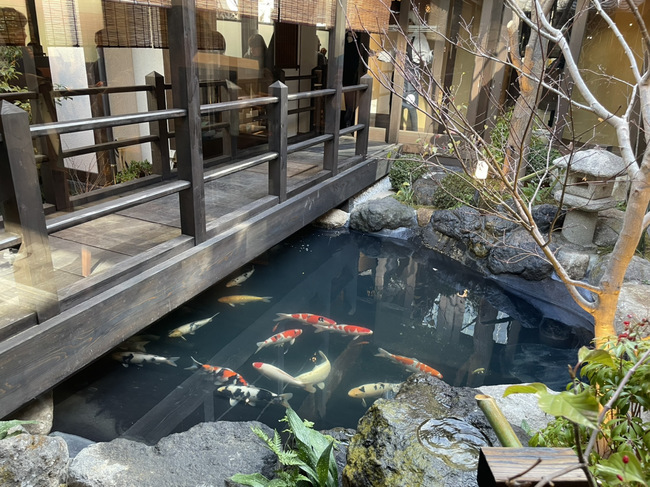 大名小学校跡地の古民家を大規模改装し、中庭には池が配置されています。池を望むカウンター席や渡り廊下など、都市のにぎわいの中で非日常を感じられる空間。ビジネス利用や会食、記念日など、さまざまなシーンで利用することが可能です。