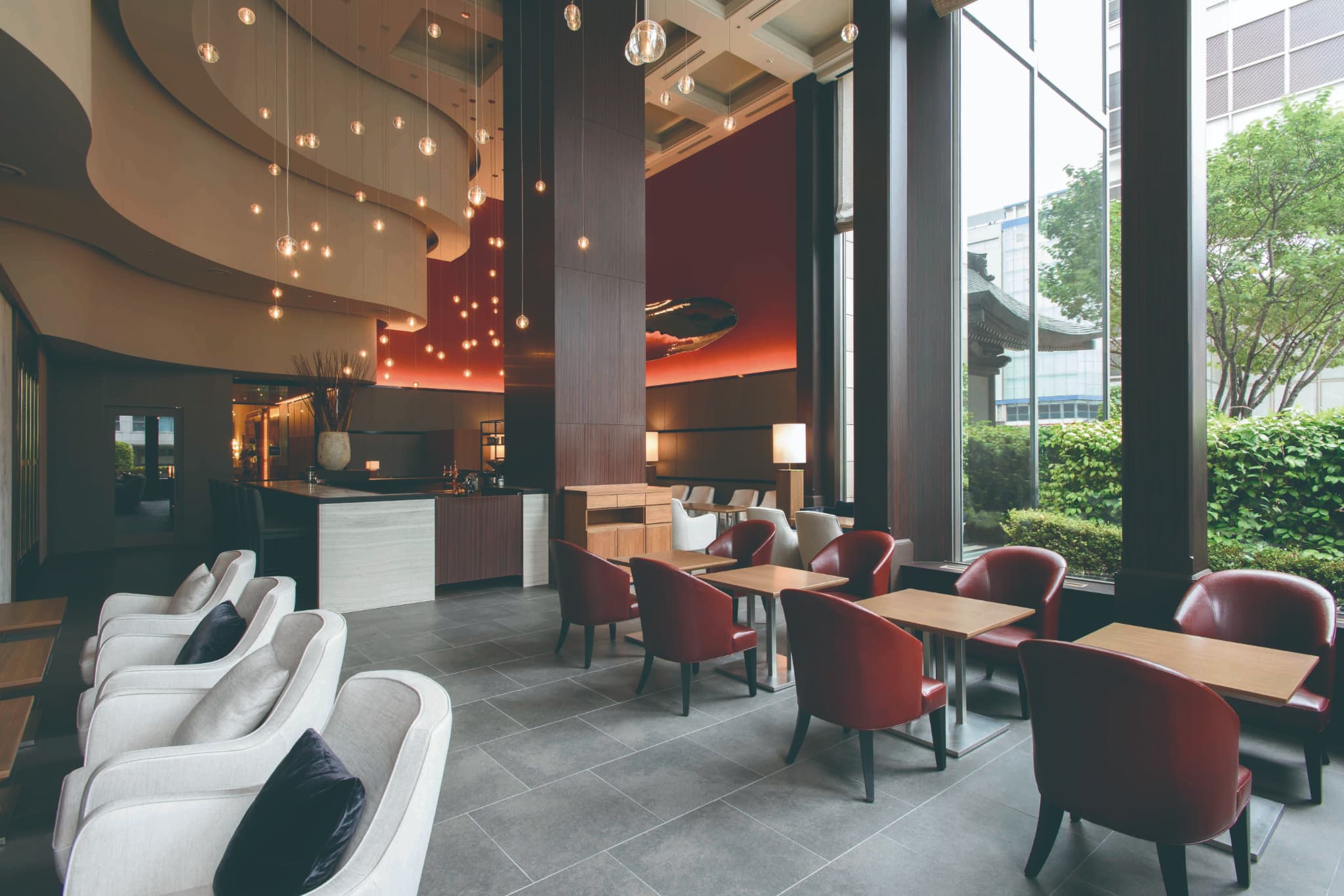 会場となる「ラウンジ&バー ハカタガワ」は、吹き抜けの高い天井と大きな窓が特徴の開放的な空間。ハンドドリップで淹れる香り高いコーヒーやお酒とともに、ゆったりとした時間を過ごせます。夜は柔らかな光に包まれ、観劇後の語らいにぴったりです。