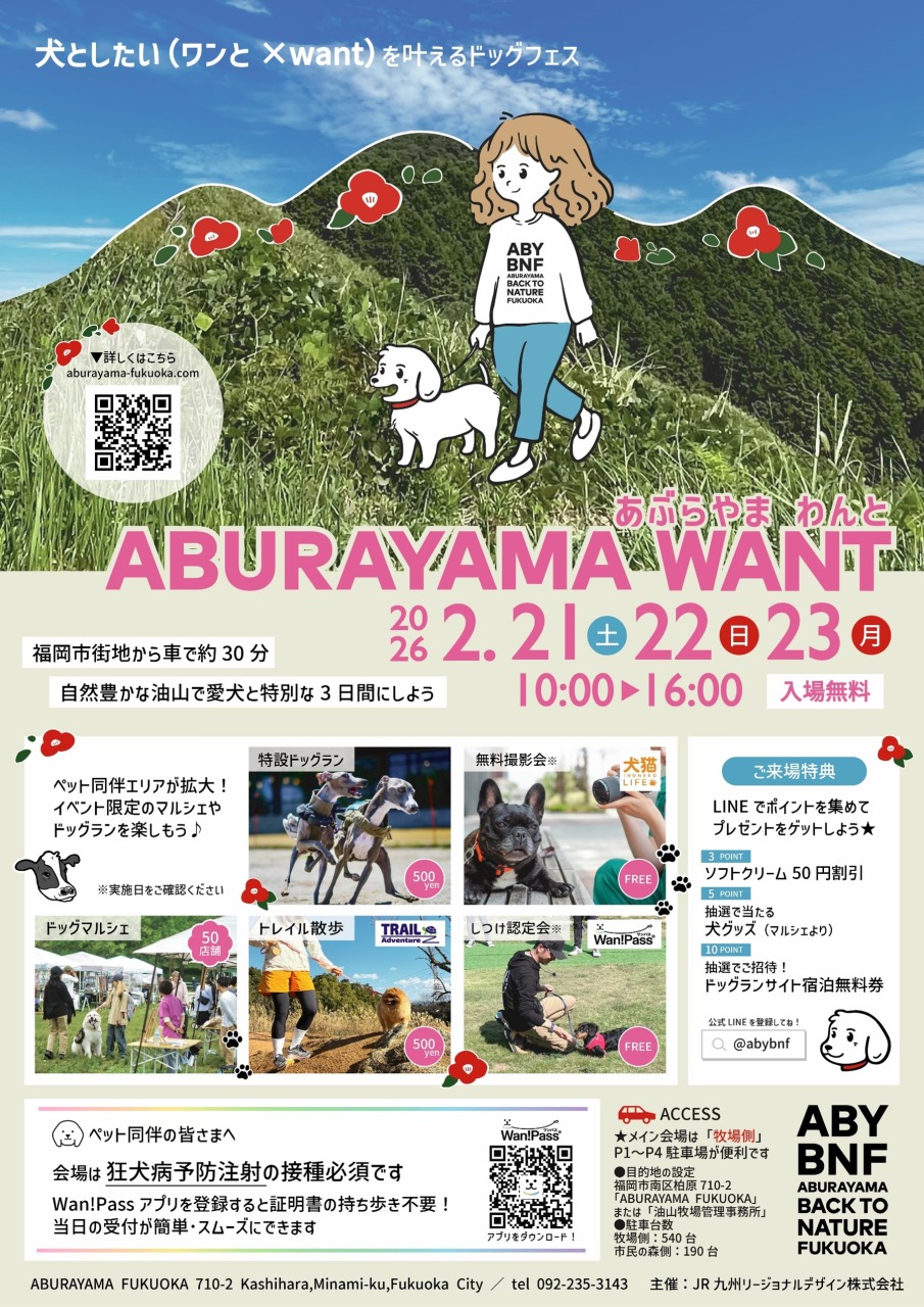 福岡市南区の人気スポット「ABURAYAMA FUKUOKA」で、愛犬家必見のドッグイベント「ABURAYAMA WANT(あぶらやま わんと)」が開催されます。会期は2月21日(土)・22日(日)・23日(月・祝)の3日間。入場無料(※駐車料金別途)で、犬と人が一緒に楽しめる特別な時間が用意されています。