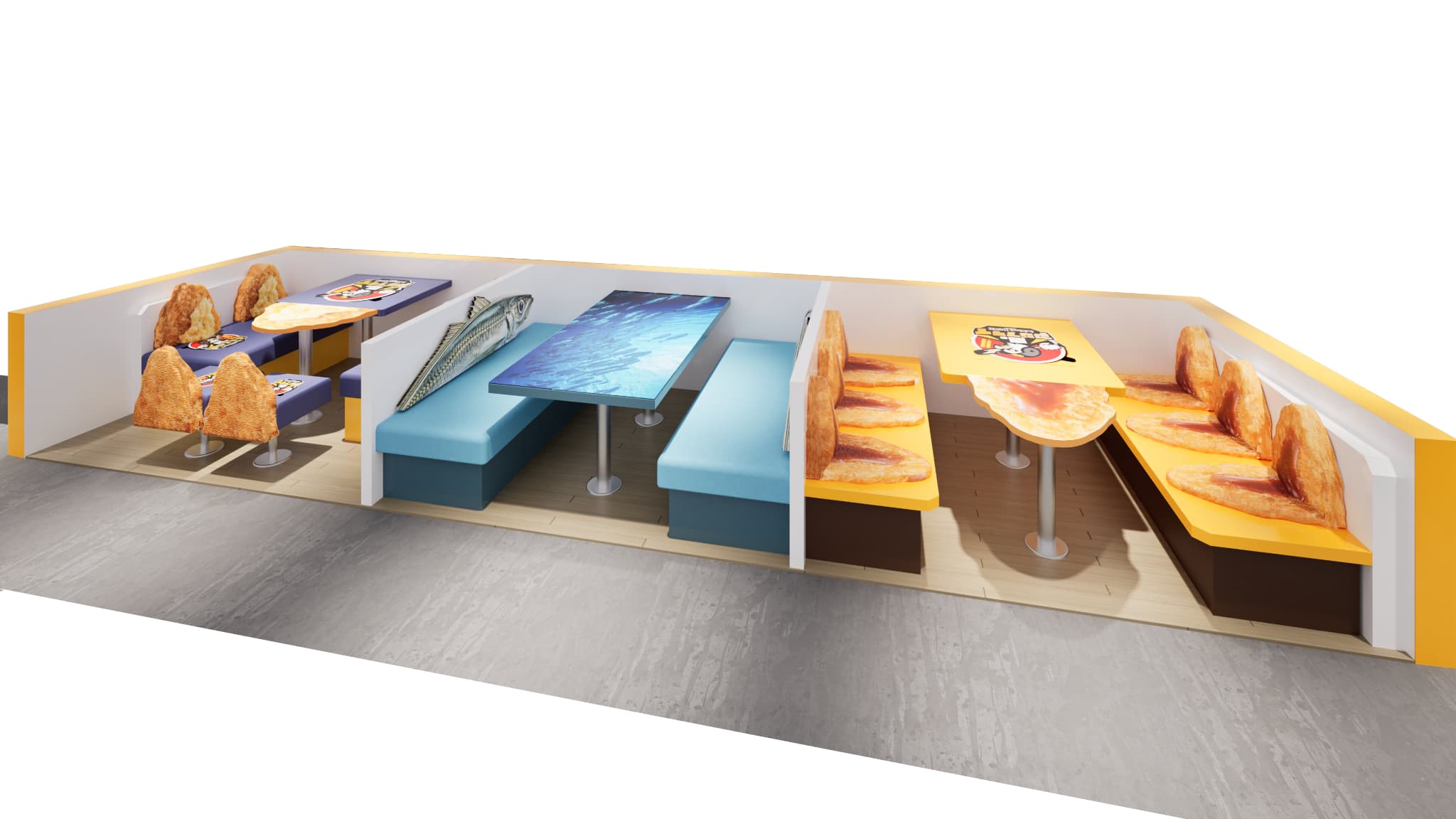 1BOXにつき最大6名で利用可能。家族や友人同士など、グループでの観戦にぴったりの空間です。座席にはアジフライをイメージしたデザイン家具が並び、写真映えする遊び心ある空間演出が施されています。