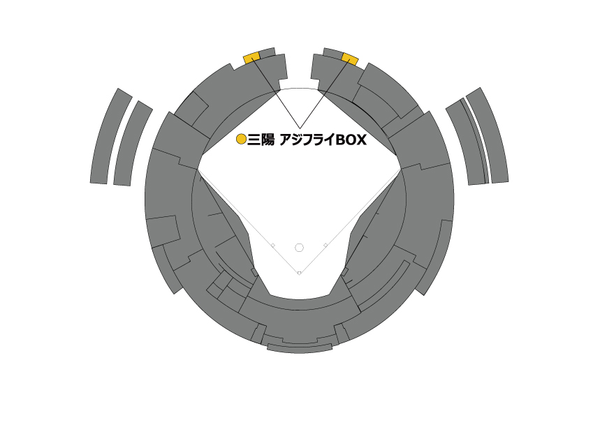 福岡ソフトバンクホークス株式会社と、福岡市中央区の鮮魚加工・販売などを手がける株式会社三陽がネーミングライツ契約を結び誕生した「三陽 アジフライBOX」。ドームグルメとして人気の「鷹のアジフライ」をモチーフにデザインされ、外野席後方に6BOX(計36席)が設置されます。
