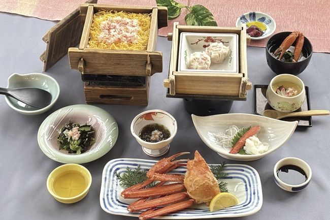カニ御膳…紅ズワイ(半身)、カニ入り茶碗蒸し、カニしゅうまい、カニ刺身とイカ刺身 、カニのセイロ蒸しご飯