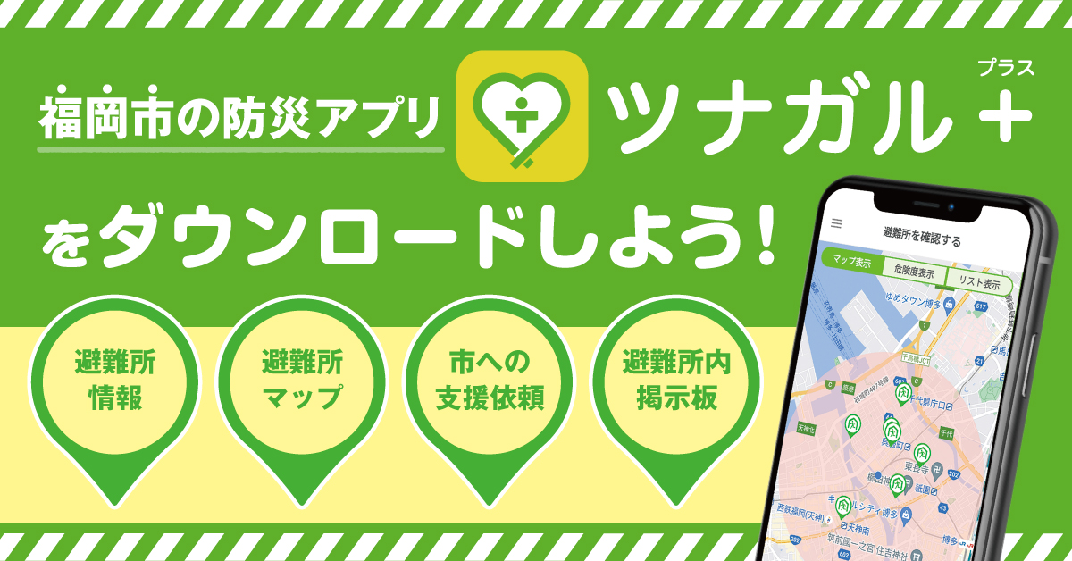 大雨や地震など、いざという時真っ先に気になるのが「近くの避難所はどこ?」ということ。そんな時に役立つのが、福岡市の防災アプリ「ツナガル+(プラス)」です。災害時には最寄りの開設避難所を一覧・地図で確認でき、避難所内での情報共有も可能。平常時から避難所の場所や設備、ルート、ハザード情報をチェックできます。