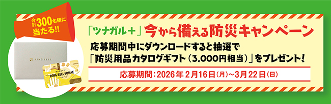 2026年2月16日(月)~3月22日(日)の期間中、「今から備える防災キャンペーン」が実施されています。応募期間中にアプリをダウンロードすると、「防災用品カタログギフト(3,000円相当)」が抽選で合計300名に当たります。