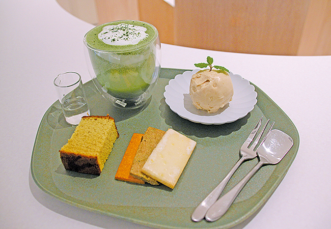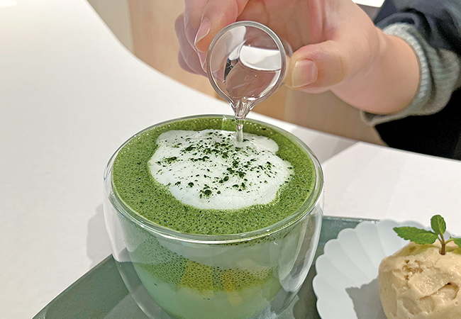 甘い香りが広がる「月桃(げっとう)と八女抹茶のラテ」。