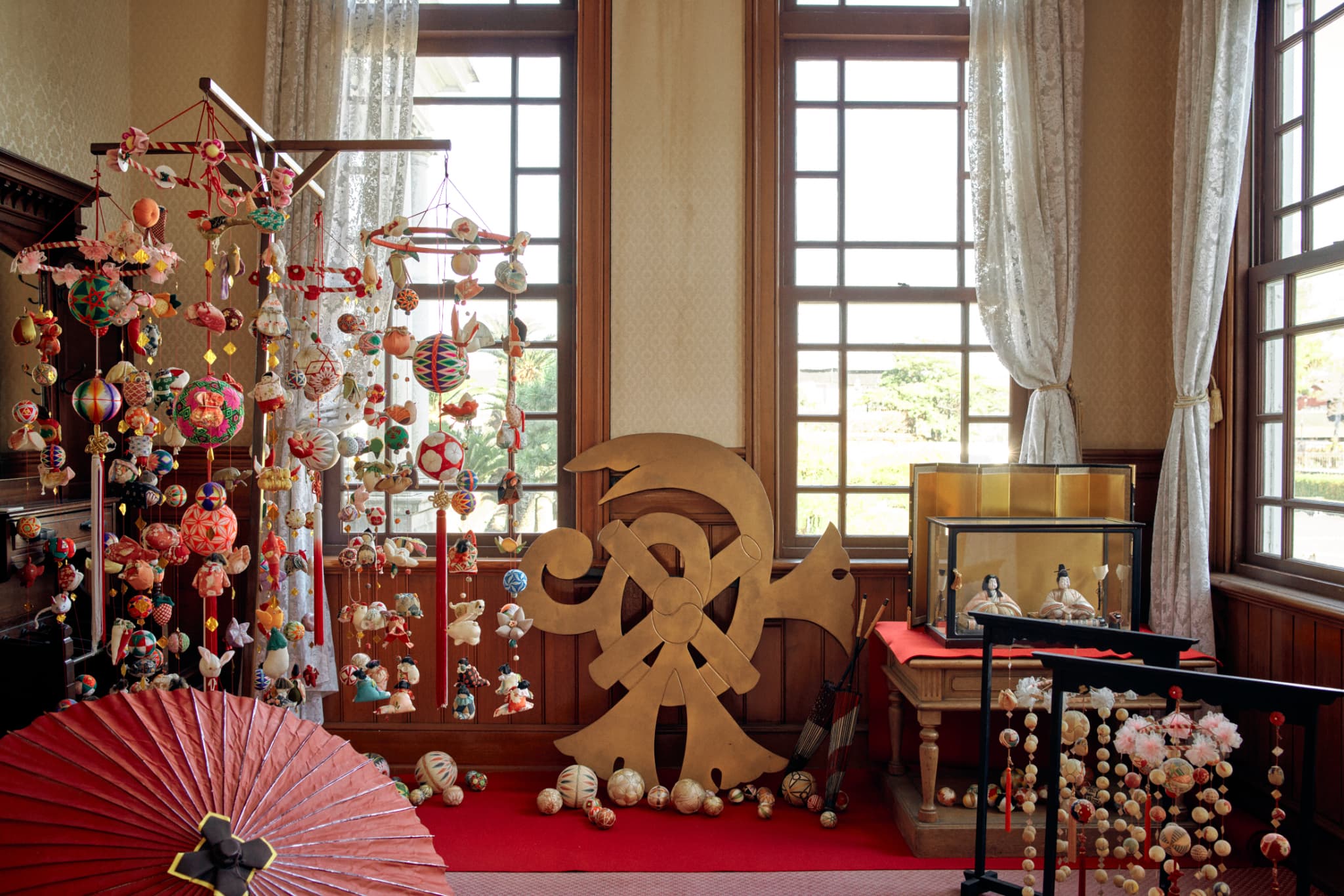 文化財・西洋館の一角に、期間限定フォトスポットが登場。立花家の家紋「祇園守紋」を背景に、成長と幸せを願うさげもんが飾られた空間で、特別な1枚を撮影できます。宿泊者だけでなく、日帰り利用でも写真撮影が可能です。柳川の伝統に包まれる思い出づくりにぴったりです。