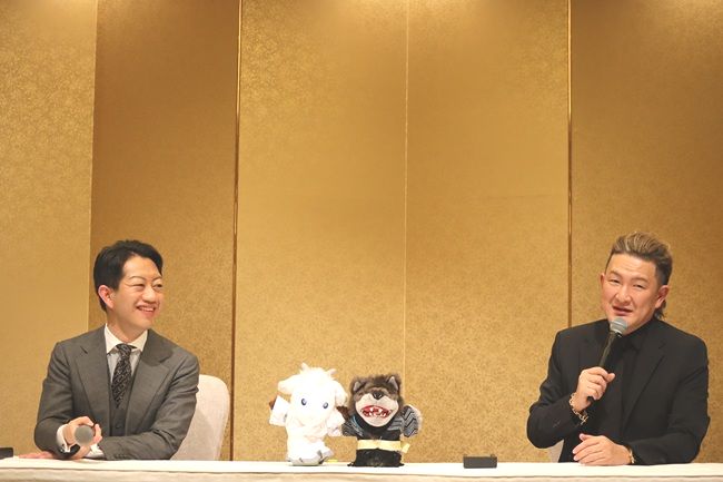 博多座(福岡市博多区)で約8年ぶりに上演される新作歌舞伎「あらしのよるに」。オオカミとヤギの友情を描いた原作絵本との出合いから中村獅童さんが歌舞伎化し2015年に初演、博多座には18年にお目見えした。再演の今回、オオカミのがぶ役は前回に続き獅童さん、ヤギのめい役を中村壱太郎(かずたろう)さんが務める。2月7日(土)の開幕を前に福岡市内で開かれた取材会で、獅童さんと壱太郎さんが作品への思いや互いについてを熱く語った。