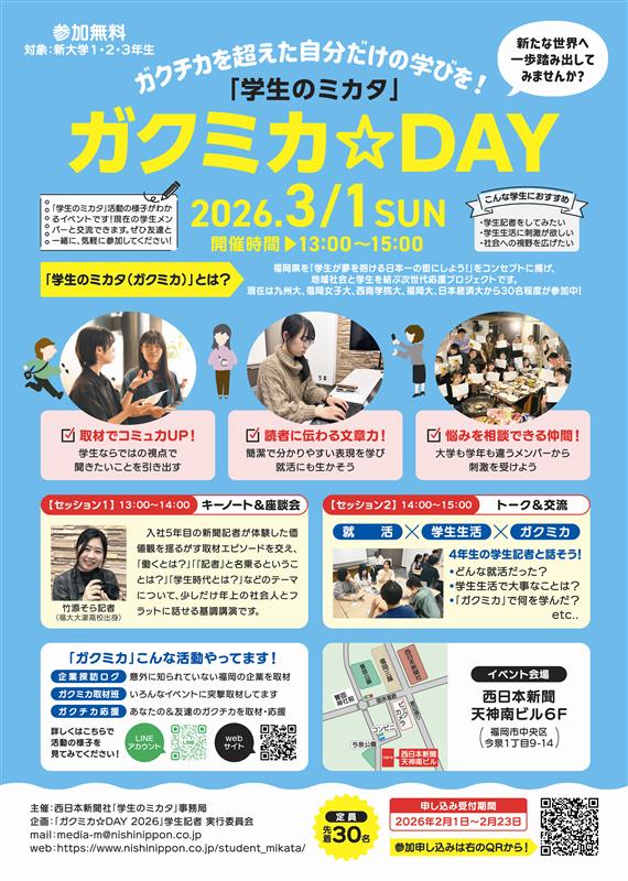 3月1日(日)13時から、西日本新聞天神南ビル(福岡市中央区)で開催されるイベント『ガクミカ☆DAY 2026』~ガクチカを超えた自分だけの学びを!~。「学生のミカタ(ガクミカ)」に所属する、大学も学年も違う学生記者メンバーたちが、「ガクミカ」でどのような活動や交流を行い、何を学び成長したのかを知ることができるイベントです。
