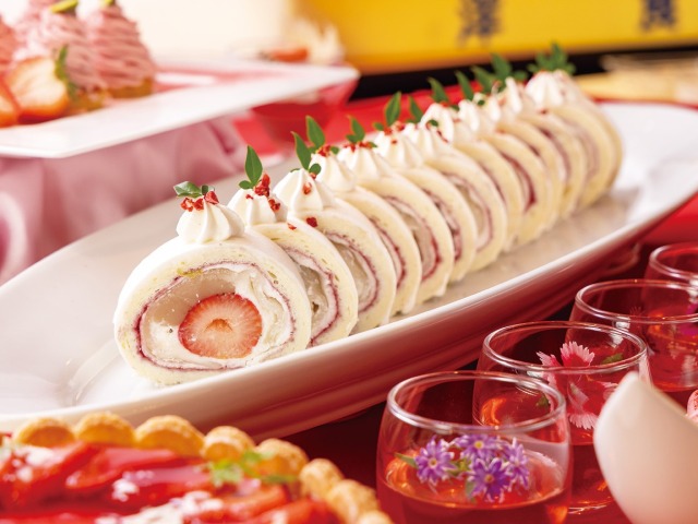 ホテルシェフが手がけるいちごスイーツと軽食がビュッフェ形式で並びます。子どもから大人まで楽しめる多彩なメニュー構成で、家族での利用にもぴったり。