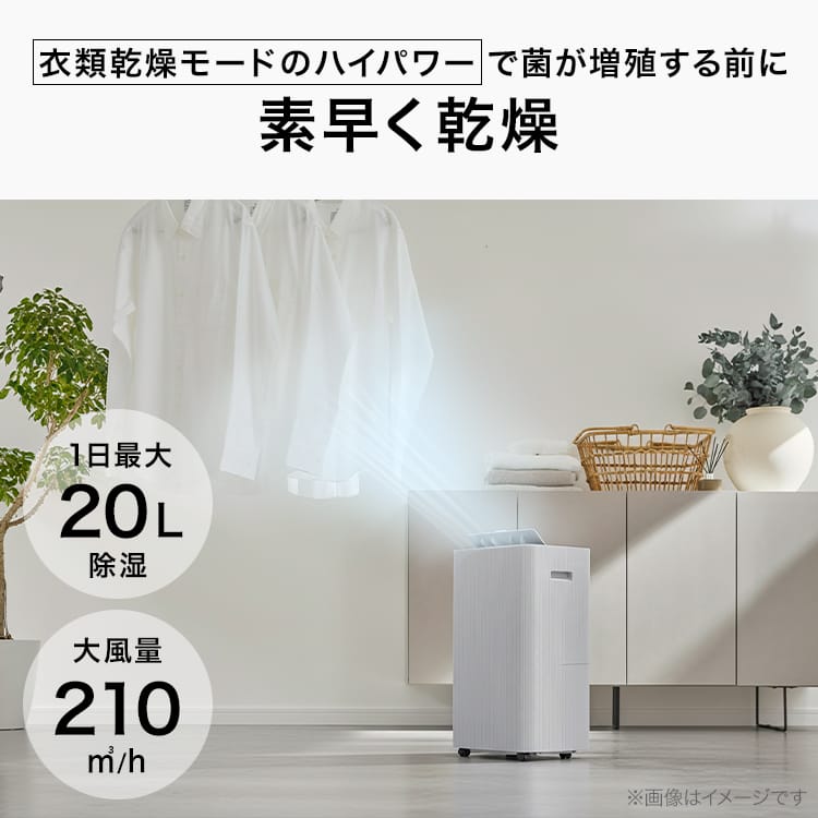 新商品の「コンプレッサー式 衣類乾燥除湿機」は、大風量で空気をしっかり循環させる除湿機。幅29×奥行24×高さ52.5cmとコンパクトで、部屋に馴染むデザインも印象的です。1日最大20Lの除湿能力に加え、衣類乾燥モードも搭載され、室内干しでも空気がこもりにくい設計になっています。