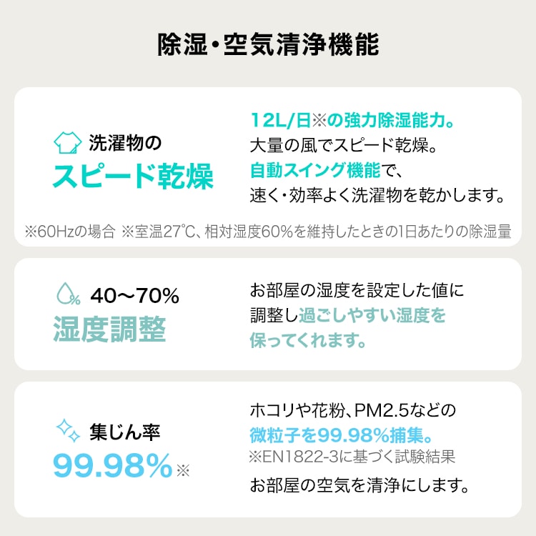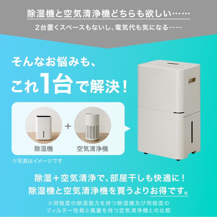 花粉やPM2.5などの微粒子を99.98%ろ過する集塵フィルターを搭載した「空気清浄機能付き除湿機」も、いまなら約50%オフで購入可能。専用HEPAフィルターも同じく約50%オフです。1日最大12Lの除湿機能付き。