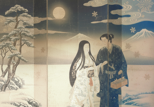 夜半を過ぎる頃、枕元に立てられたあの屏風の黒地から粉雪がひとひら、ふたひら。