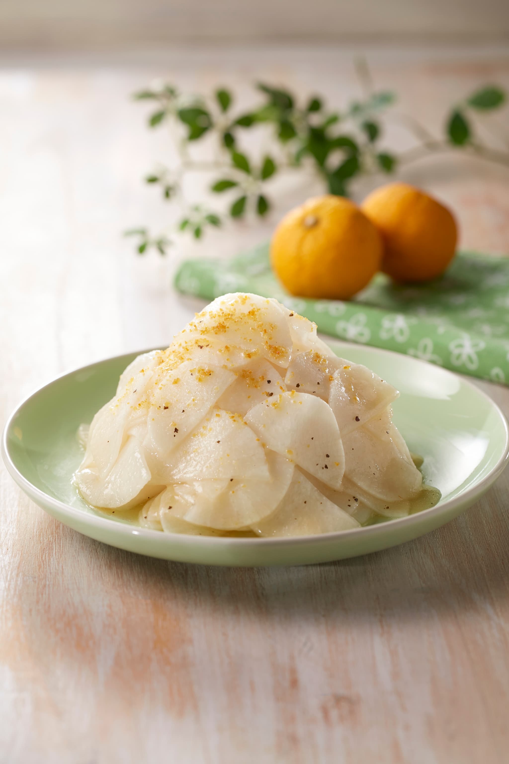 大根は水分が多く、味がしっかりしみこむ食材。そんな素材特性をいかした“マリネ風”の仕立てで、ゆずの爽やかな香りとバジルの風味が相性よく広がります。