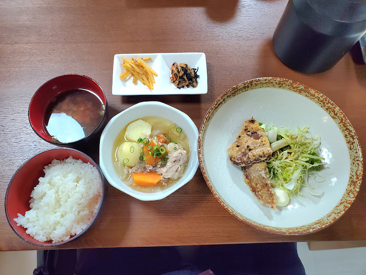 ほどなく700円ランチが運ばれてきました。肉じゃが、マグロのから揚げ、漬物、ひじきと野菜の煮物、ごはん、みそ汁(お魚の身入り)、これだけあって700円、まあ、通常850円ですが、それでもお得じゃないですか。