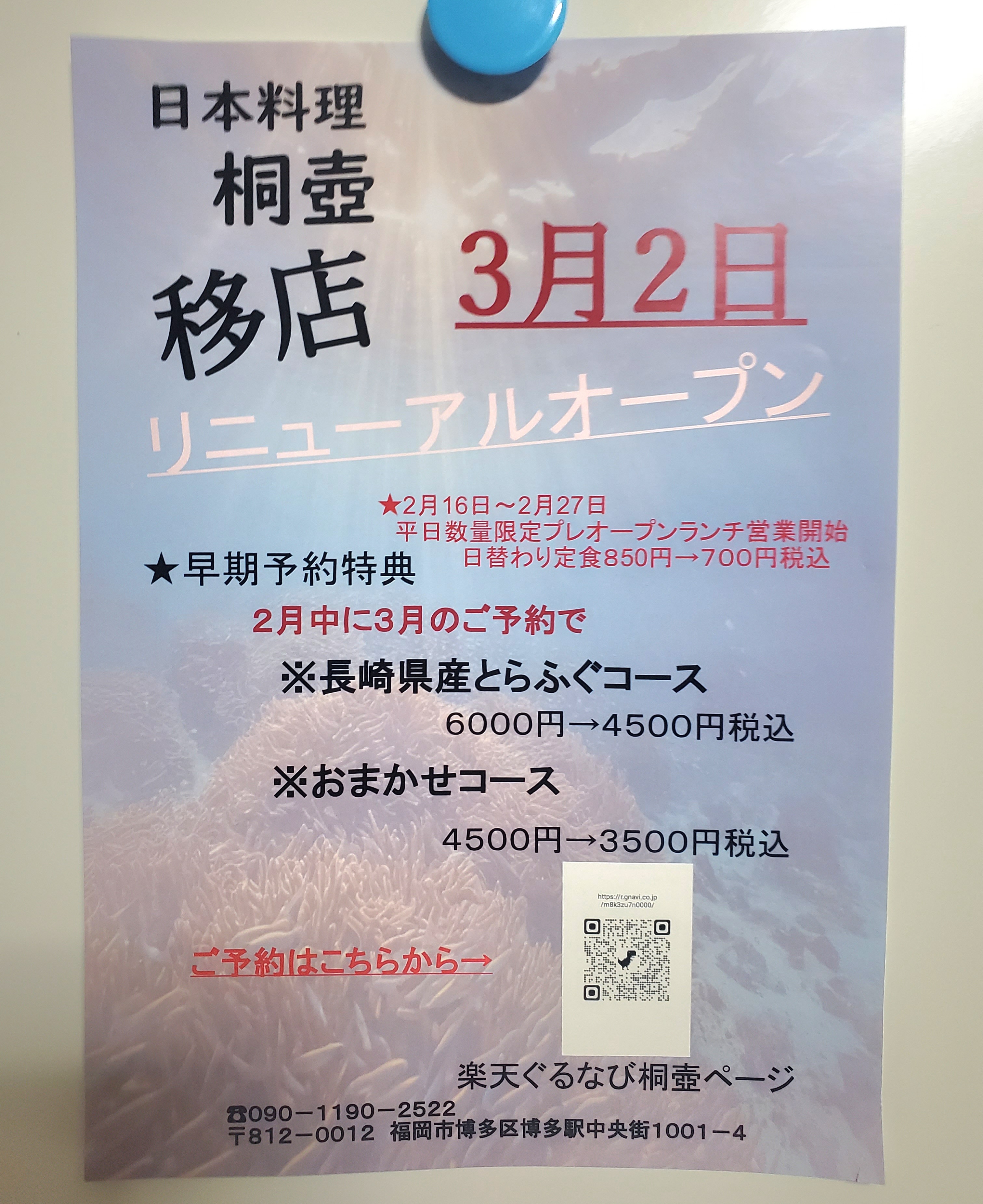 日本料理 桐壺は書いたとおり、3月2日(月)が本オープンです。2月中に予約するととらふぐコースとかが安く食べられたみたいですが、残念ながら今飲み会の予定無し。