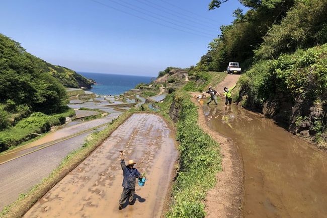 浜野浦の棚田でお米も育てていて、「この風景のなかで農作業ができるとは、なんて贅沢(ぜいたく)なこと!」と、いつも思っています。浜野浦の棚田は、約400年前の戦国時代につくられました。名護屋城築城のために集まった石工たちが技法を伝えたそうで、当時の棚田が今も残っています。海岸側から見る棚田は石垣が圧巻! で歴史を感じます。上から眺める景色とは違う迫力がありますよ。