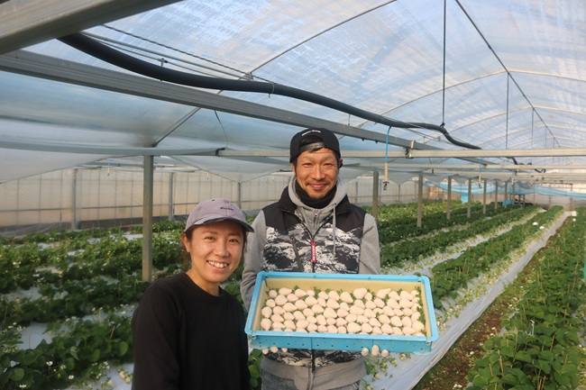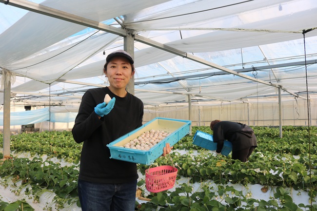 この日の仕事は白いイチゴ「こころの色」の収穫でした