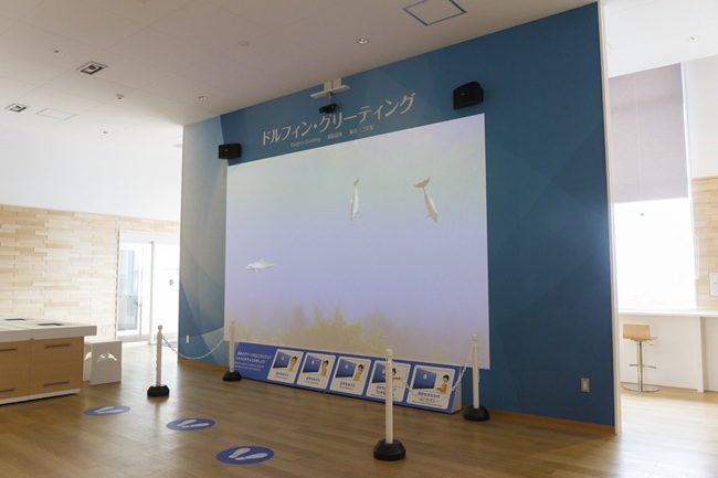 人の動きに合わせて画面のイルカが反応します。トレーナー感覚でイルカと遊べます。