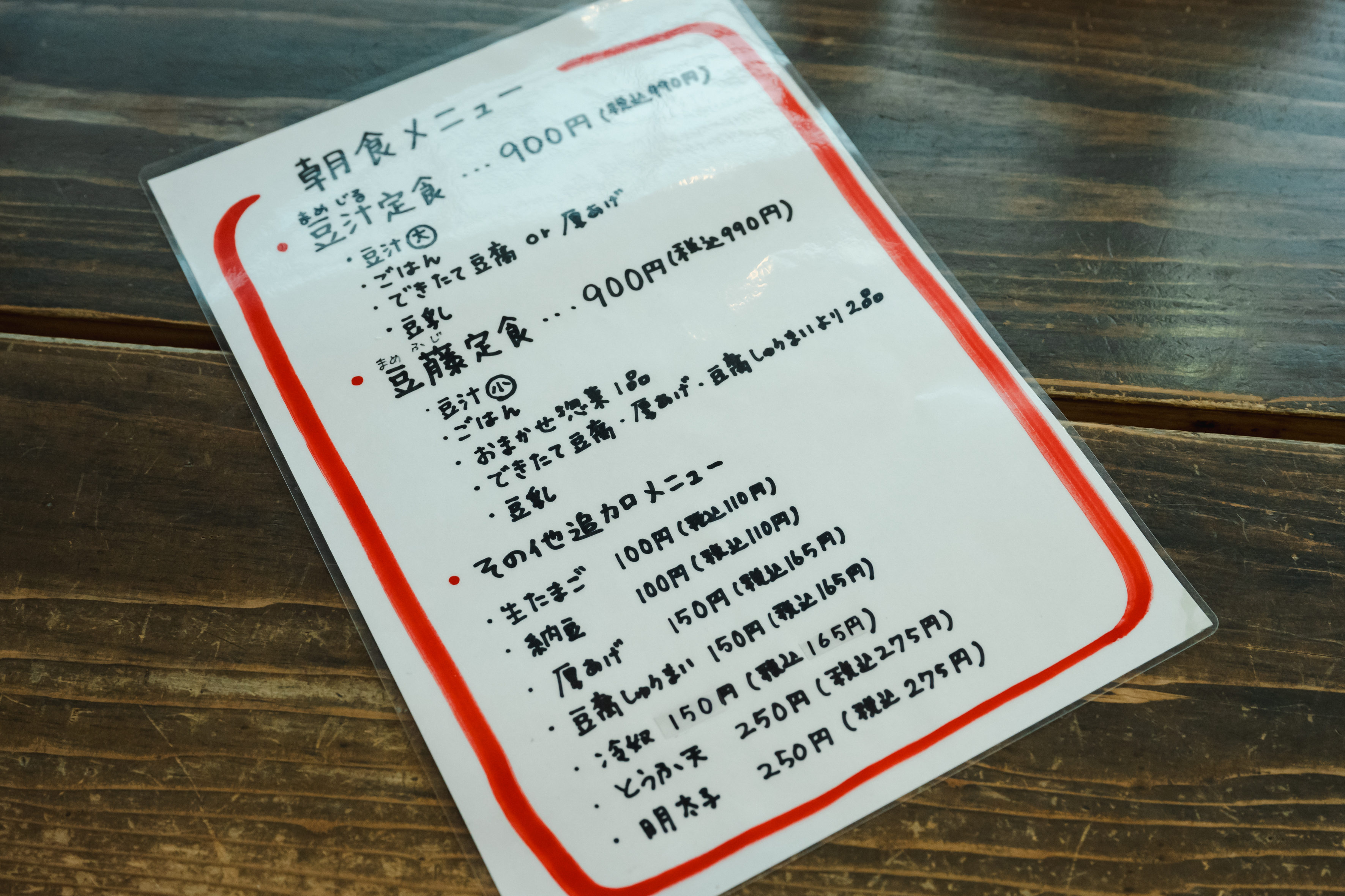 同店は午前8時にオープン。朝食メニューを見ると、「豆汁定食」と「豆藤定食」の2種類があります。特に女性に大人気という「豆藤定食」(990円)を注文します。朝食は11時30分まで注文できますが、限定50食のためお昼前には完売することも。