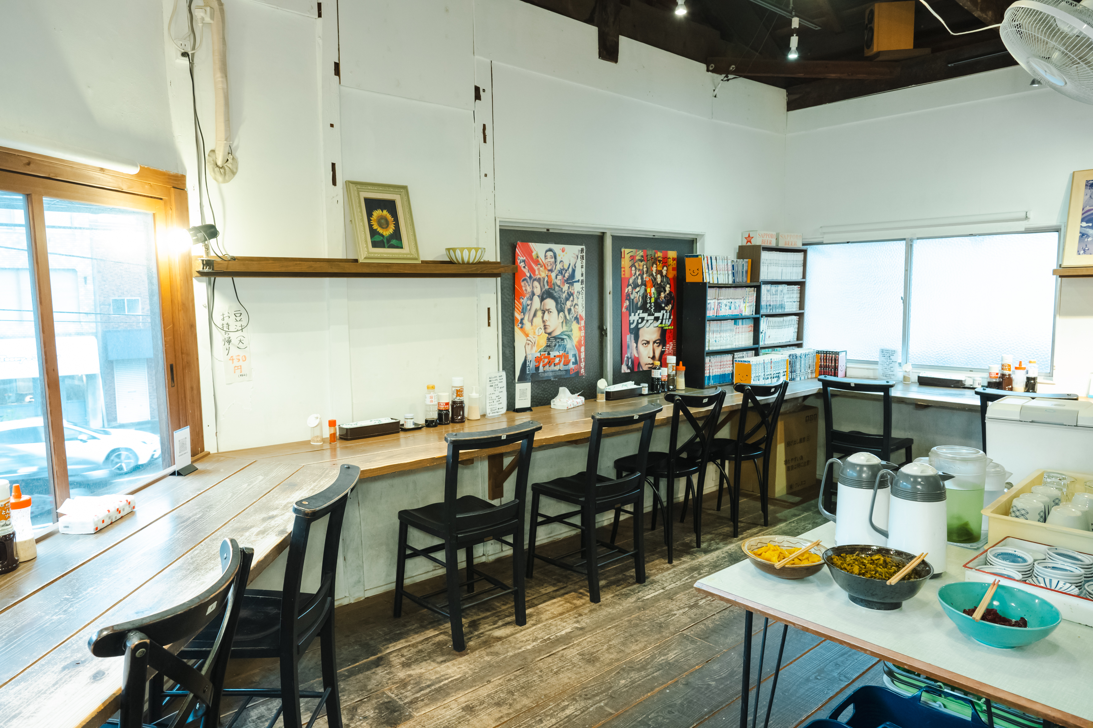 木造階段を上ると、2階はゆっくりとくつろげる食堂スペースに。古民家を改築した店内は懐かしい雰囲気で、漫画も置いてあります。