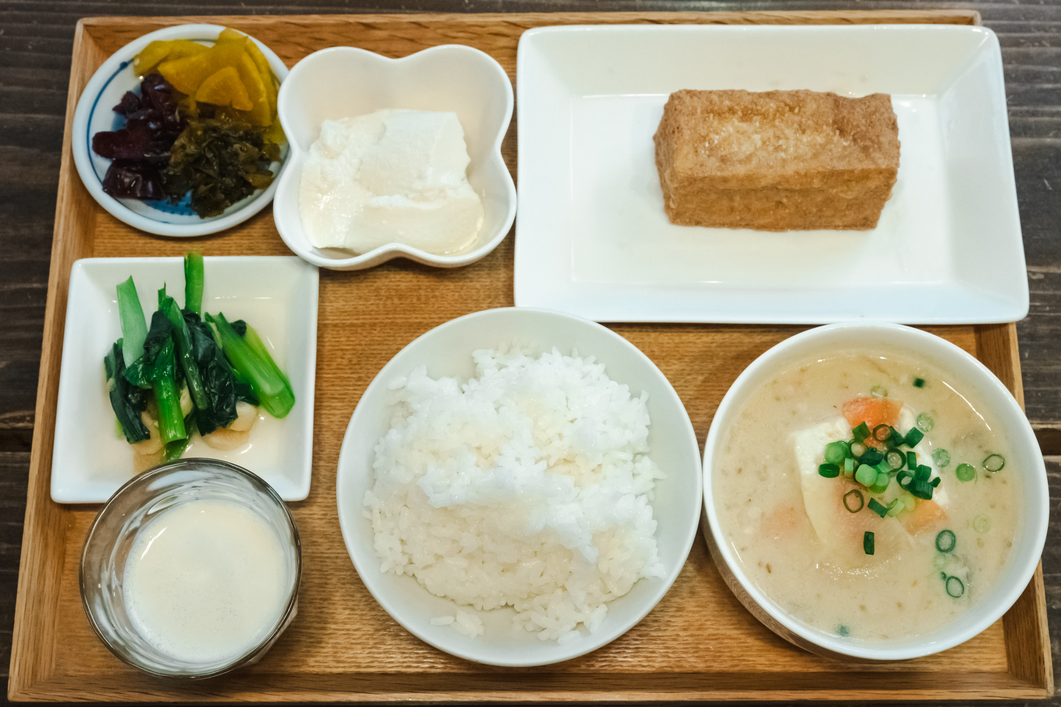 「豆藤定食」は、「豆汁(小)」、ご飯、日替わり総菜1品、「厚揚げ」「できたて豆腐」「豆腐しゅうまい」から2品、さらに豆乳が付いてきます。看板メニューの豆汁は、豚骨スープにみそと豆乳を合わせた珍しい一品で、コクがあり優しい味わい。トロンとした大きな豆腐とダイコン、ニンジン、ゴボウもたっぷり入っています。この日の日替わり総菜は「小松菜と揚げのおひたし」。栄養たっぷりです。