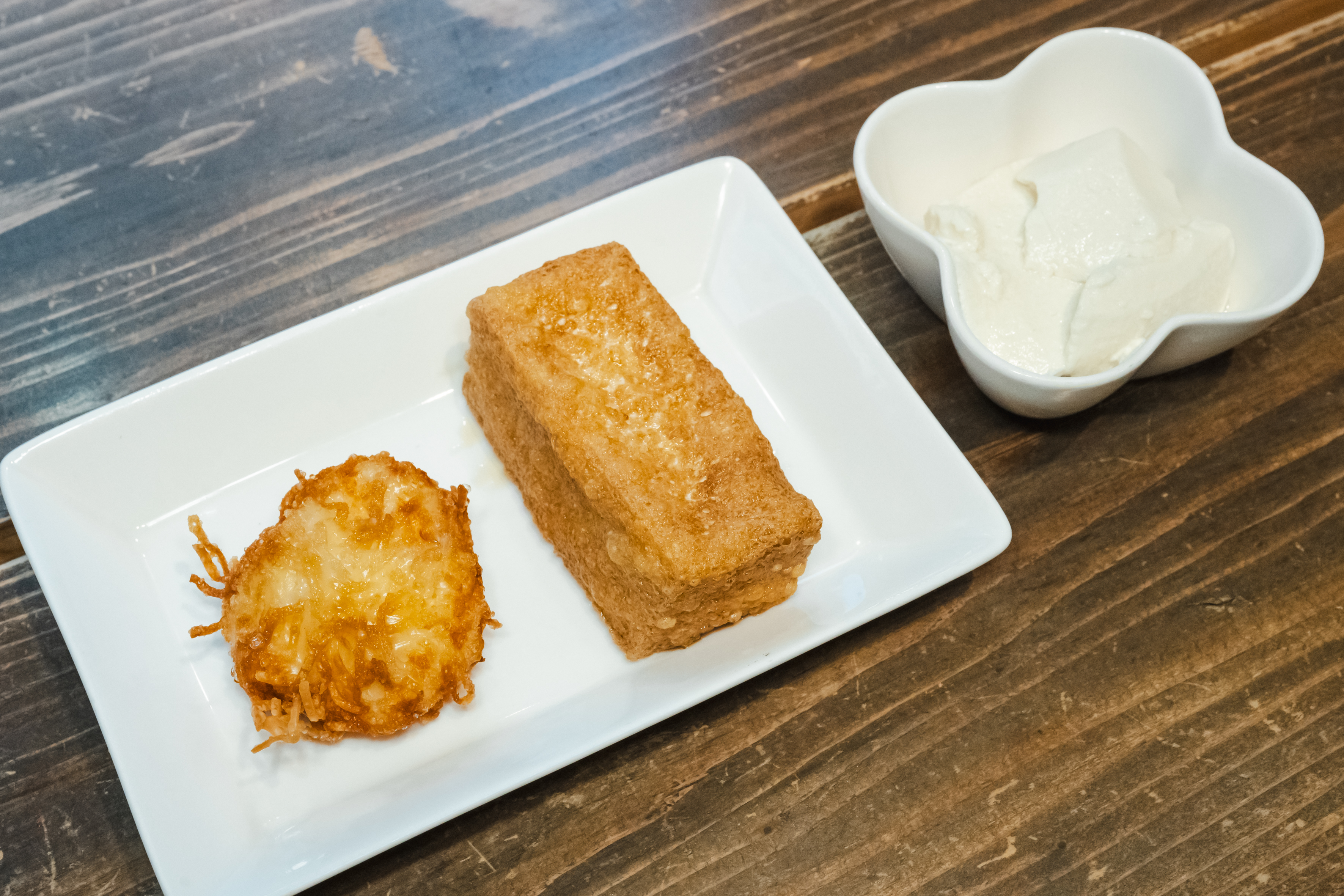 絹ごし豆腐を使った揚げたての「厚揚げ」は、外はカリッ、中はトロトロでクリーミー。1日400本売れるというのも納得の味です。毎朝店内で作るという「できたて豆腐」はトロッと滑らかで、濃厚な大豆の甘みと香りが楽しめます。