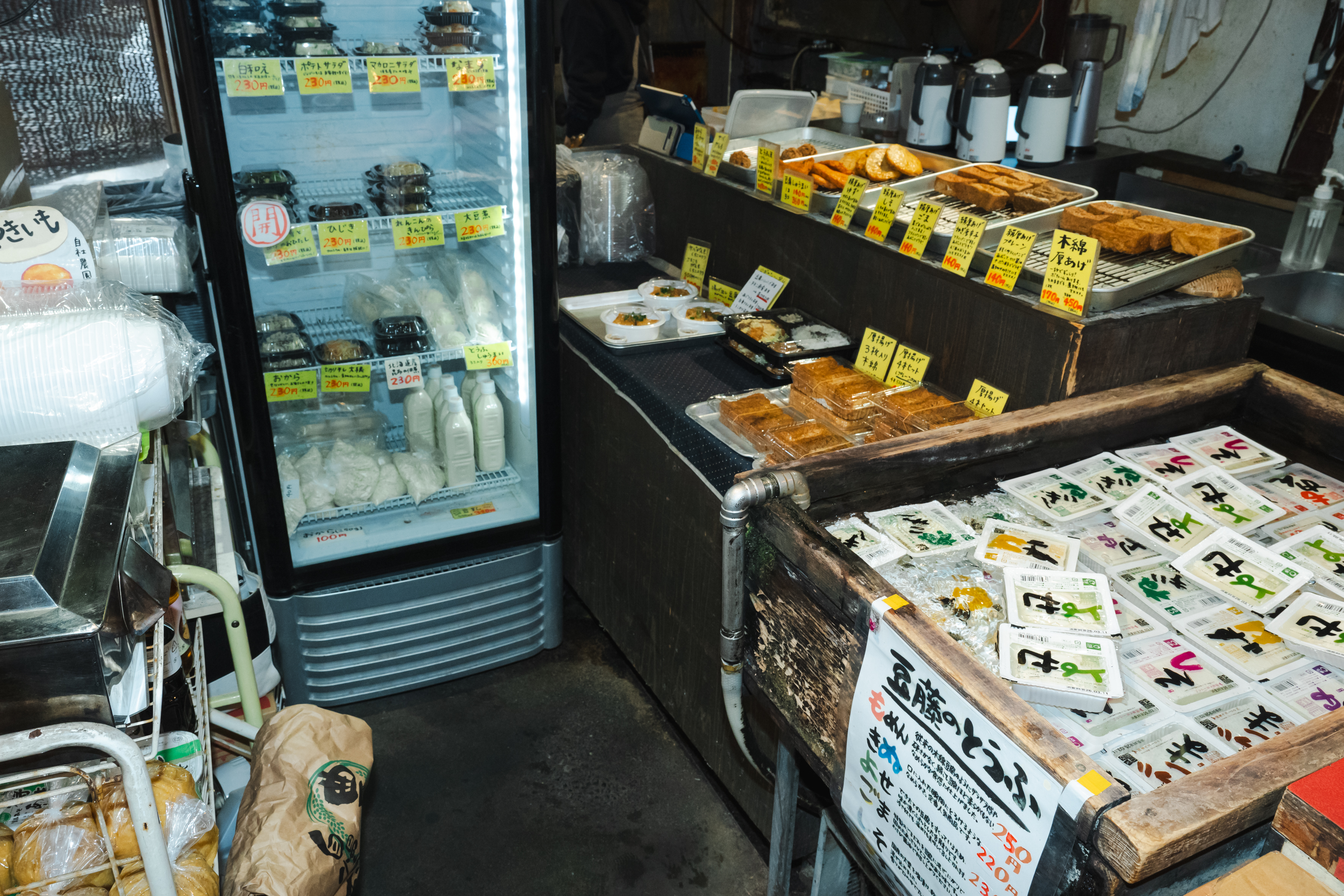 1階の販売スペースでは、同店の豆腐や総菜、調味料などを買うことができます。独自の製法で作る豆腐は「もめん」(250円)、「きぬ」(220円)、「よせ」(230円)、「ごま」(230円)、「しそ」(230円)、「ゆず」(230円)、「ねぎ」(230円)の7種類の味があります。総菜では「厚揚げ4本セット」(450円)が1番人気だそう。