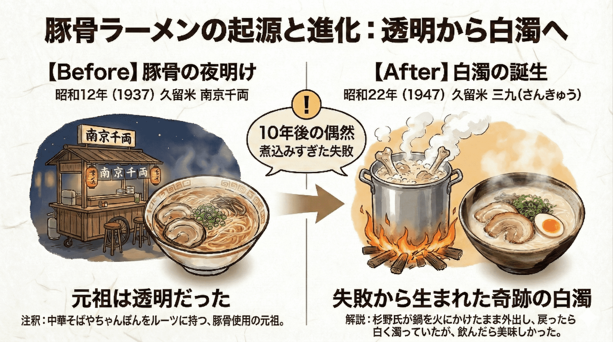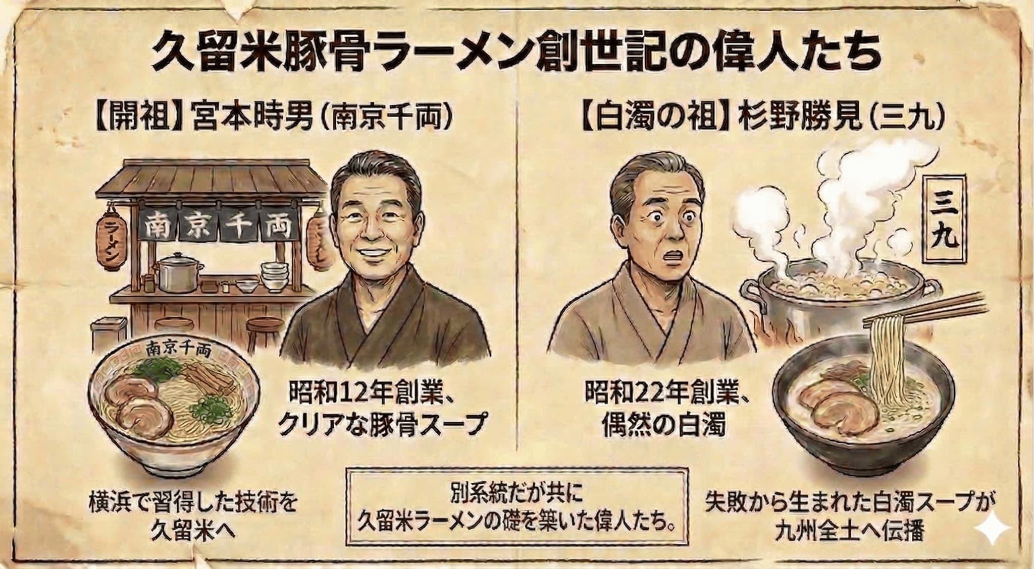 その10年後、1947年に同じく久留米で生まれた屋台「三九(さんきゅう)」では、店主の杉野勝見(すぎの・かつみ)さんがうっかりスープを白濁させてしまいます。それが現在の白濁した豚骨ラーメンのはじまりですね。
