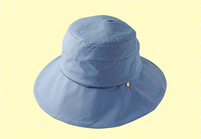 つばが広く、首回りまでしっかりUVカット。ワイヤー入りで形は自由に変えられるのがうれしい。つば裏は白地なので、顔映りが明るくなる効果も♪