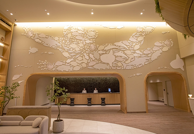 1階ロビーでひときわ目を引くのは、博多人形師の中村弘峰氏が手がけた壁画「Prince of the Ocean」。