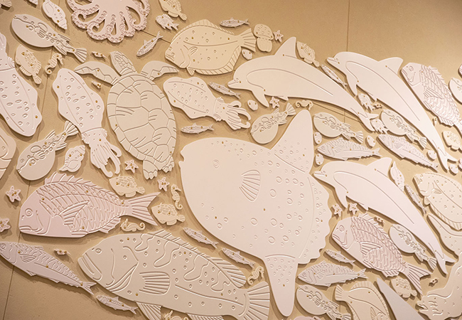 縦4メートル、横12メートルの大作で、一つ一つのレリーフがパーツとなり全体で〝海の王子〟を形づくっています。