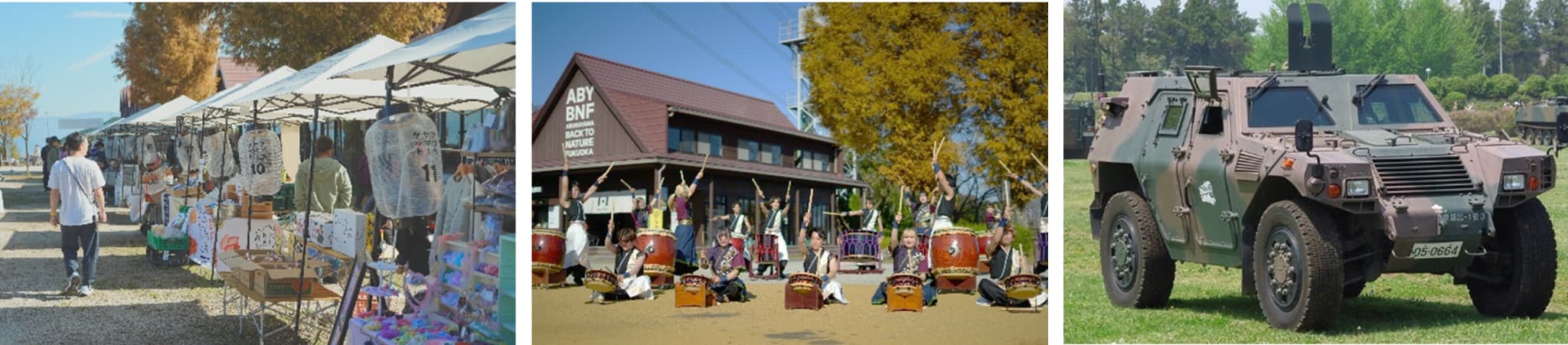 4月最後の週末は、「豊かさにふれる」マーケットを開催。自然に囲まれた空間での買い物に加え、25日(土)は自衛隊車両やパトカーの展示、26日(日)は福岡大学和太鼓部「鼓舞猿」による特別公演も行われます。グリーンウッドワークや食品サンプルづくり体験など、学びと発見の時間も楽しめます。