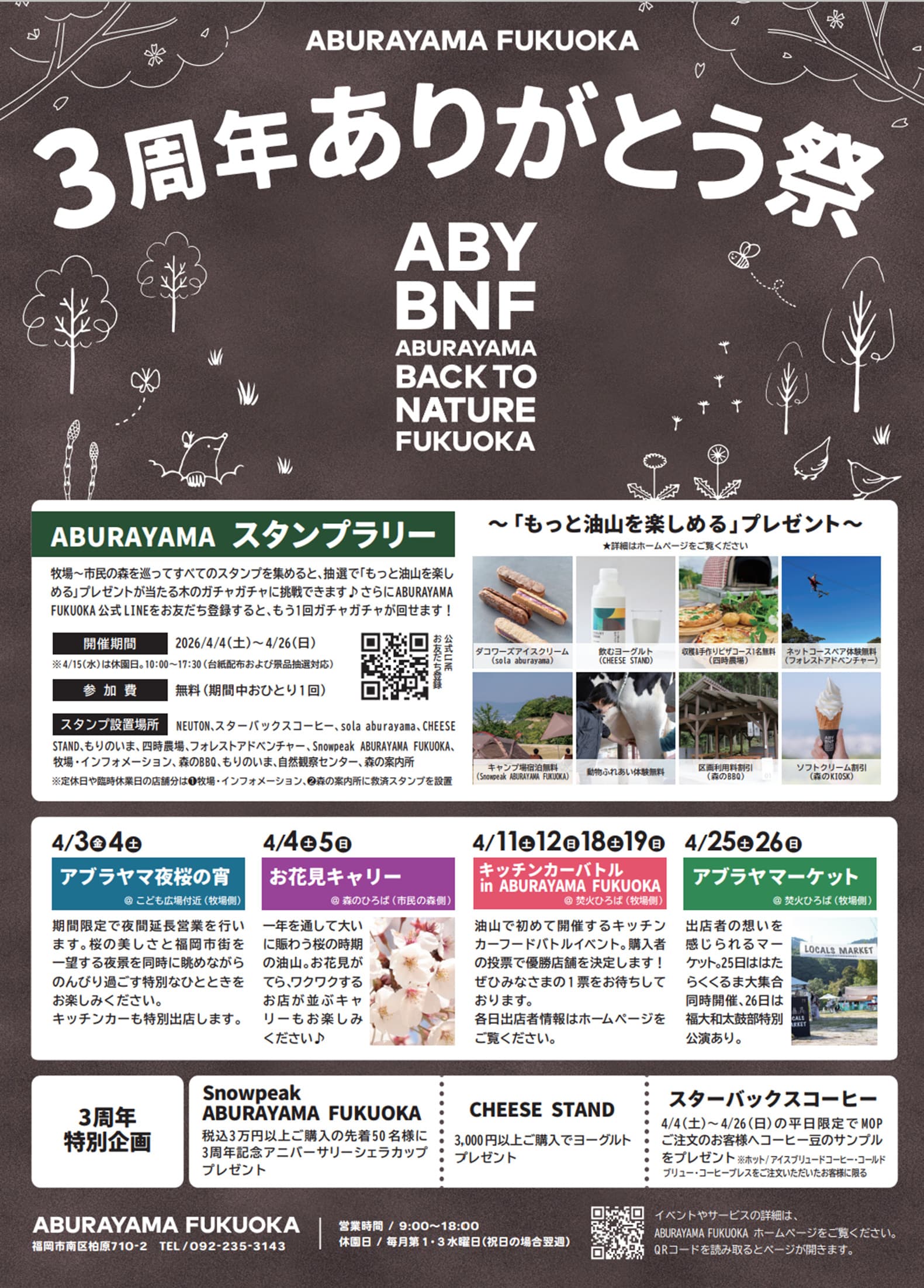 春の油山ならではの開放感の中で、週末ごとに違った楽しみ方ができる「3周年ありがとう祭」。この機会に、ABURAYAMA FUKUOKAでお気に入りの過ごし方を見つけてみてください♪