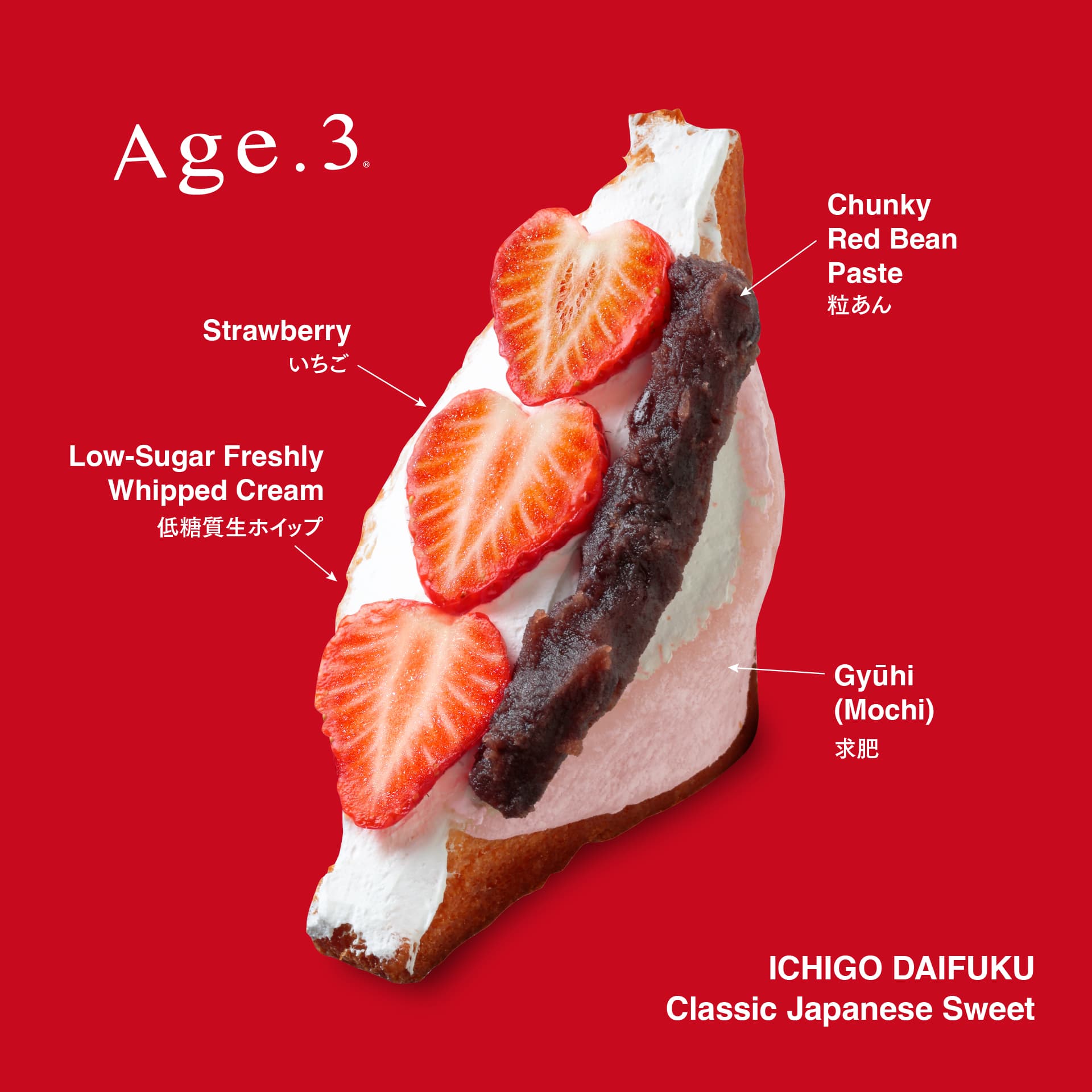 主役となる苺は、みずみずしさと爽やかな酸味が特徴。やさしい甘さのつぶあんが寄り添い、Age.3の代名詞でもある低糖質生ホイップクリームが全体を包み込みます。甘さを抑えた軽やかな口どけで、素材それぞれの輪郭が引き立つのもポイント。