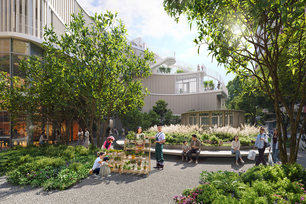 園内には、飲食店や運動施設(温浴施設など)を含む店舗棟(全7店舗)も設置予定。誰もが利用しやすい設計で、テラスや屋上広場、上りたくなる屋外階段など、店舗を利用しない人も立ち寄りやすいオープンスペースが整えられます。