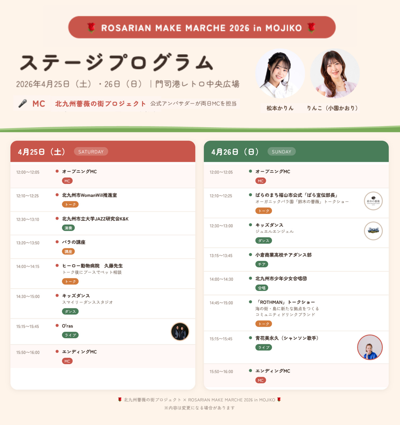 会場ステージでは、ジャズ演奏、キッズダンス、チア、合唱、アーティストライブを予定。MCは北九州薔薇の街プロジェクトアンバサダーの松本かりんさんと、りんこ(小園かおり)さんが担当します。