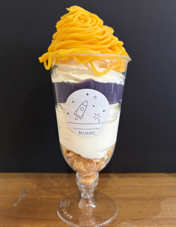 種子島で創業100年の老舗「菓子処渡辺」は、希少品種「種子島ゴールド」とねっとり甘い安納芋を使った安納芋モンブランパフェ(1点1,080円)を用意します。