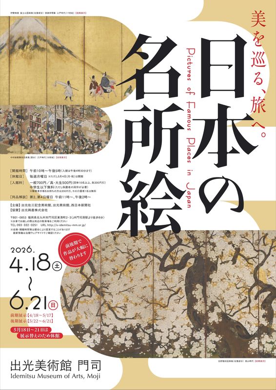 出光美術館(門司)では、日本各地の名所を描いた作品を出光コレクションから紹介。時代とともに生まれてきた「名所」を絵画でたどり、美術館にいながら名所旅行を楽しめます。前期(4月18日~5月17日)・後期(5月22日~6月21日)で展示替えも行われます。