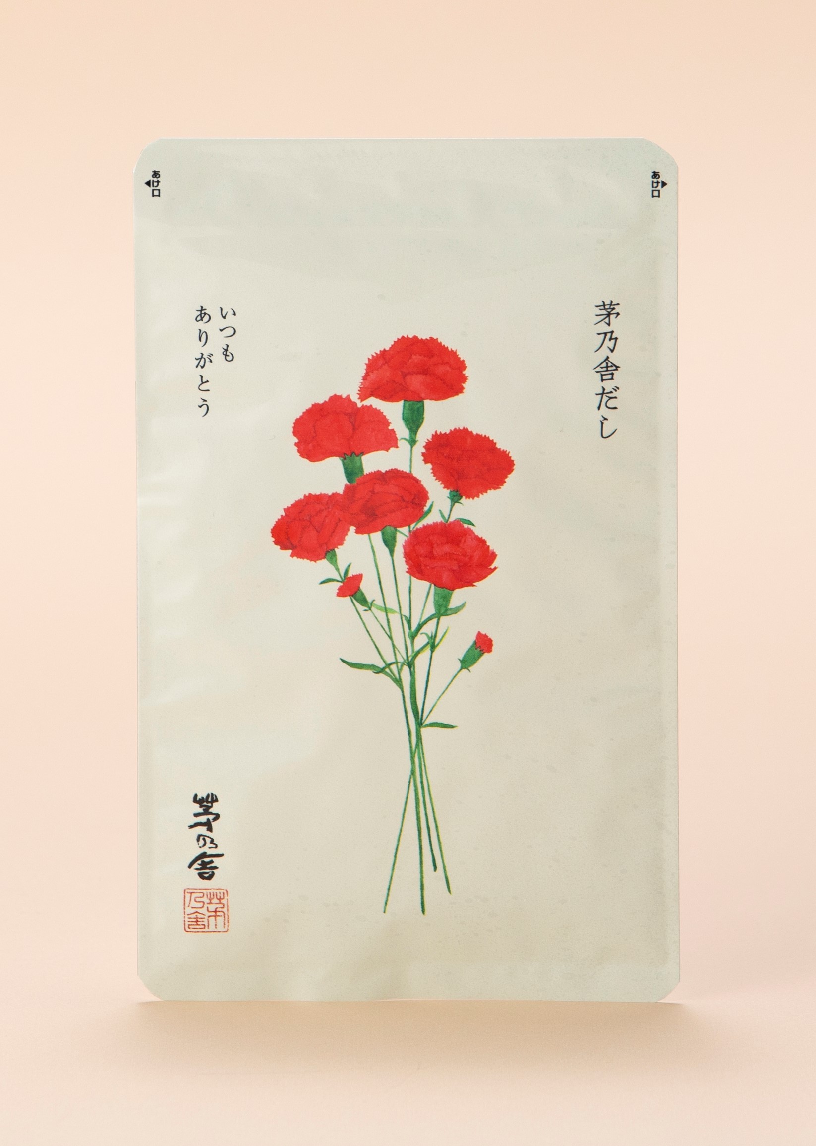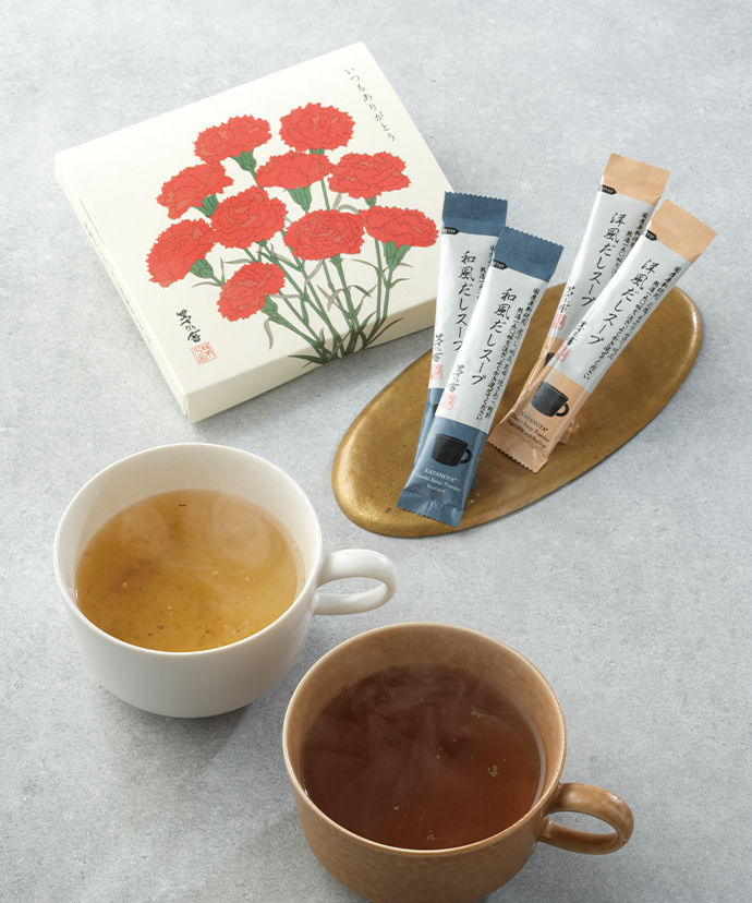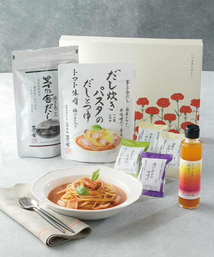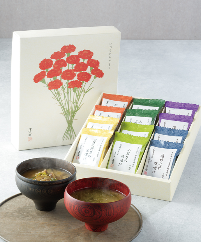 毎年人気のカーネーション柄デザイン「茅乃舎だし」をはじめ、お湯を注ぐだけで完成するフリーズドライの味噌汁やスープ、ご飯の素などを用意。手軽さとおいしさを兼ね備えた内容で、日々の食卓を支えてくれます。