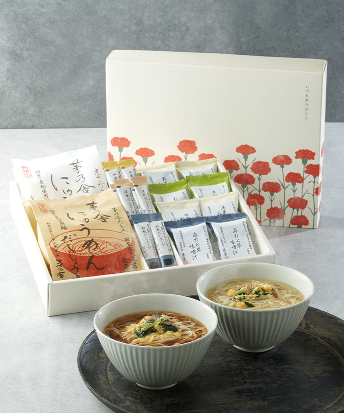 にゅうめんや味噌汁、各種だしスープを母の日限定パッケージで楽しめます。
