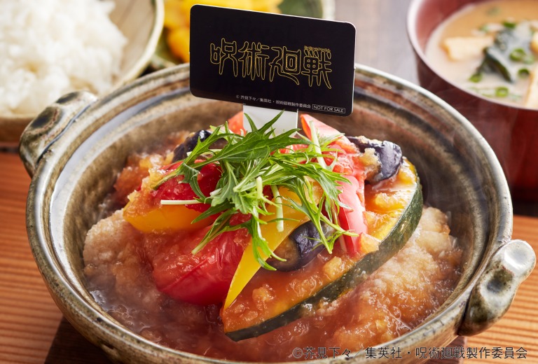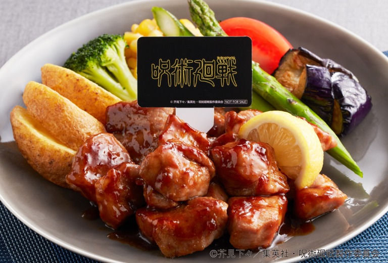 「伏黒恵の豚肩ロースのポークジンジャー」(税込1,318円)は、生姜に合うものが好きという伏黒のキャラクター設定をそのままメニューに落とし込んだ一品。アスパラ、ナス、トマトなど豊富な付け合わせで、レモンをかけてさっぱりと楽しめます。