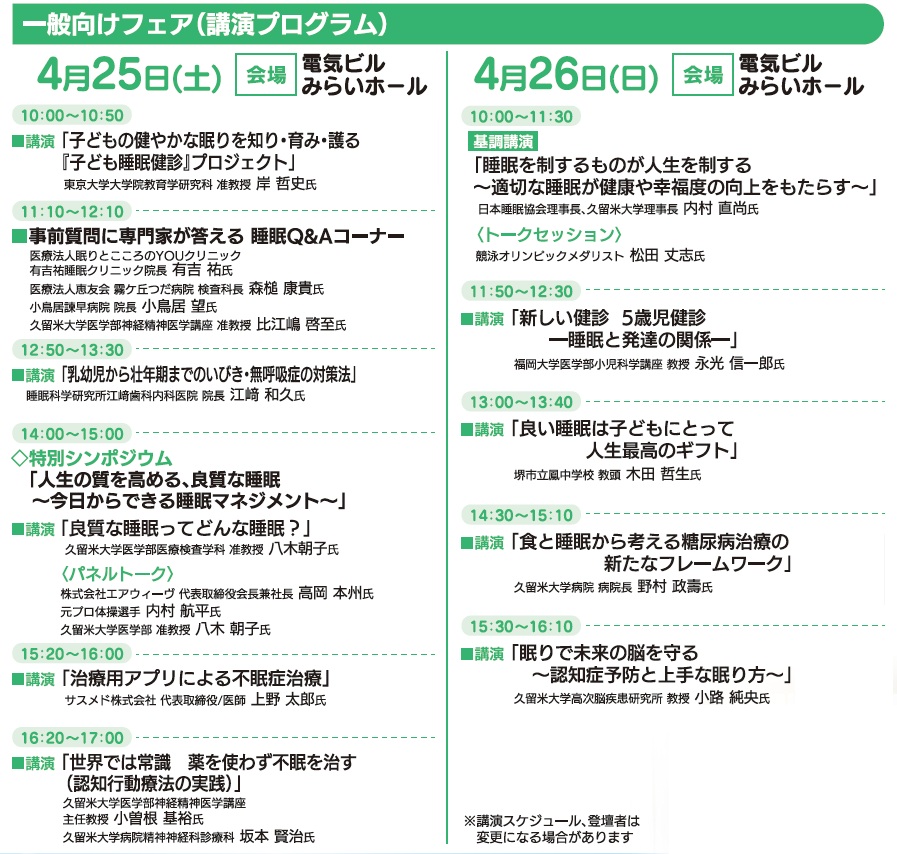 日時:4月25日(土)、26日(日)10:00~17:00 会場:電気ビルみらいホールおよびカンファレンスA・B(福岡市中央区渡辺通2-1-82 電気ビル共創館3、4階) 主催:ふくおか睡眠フェア2026実行委員会(日本睡眠協会、西日本新聞社、RKB毎日放送) 内容:専門家による各種講演、企業ブースでの情報提供、相談コーナー、体験型セミナーなど。入場無料。