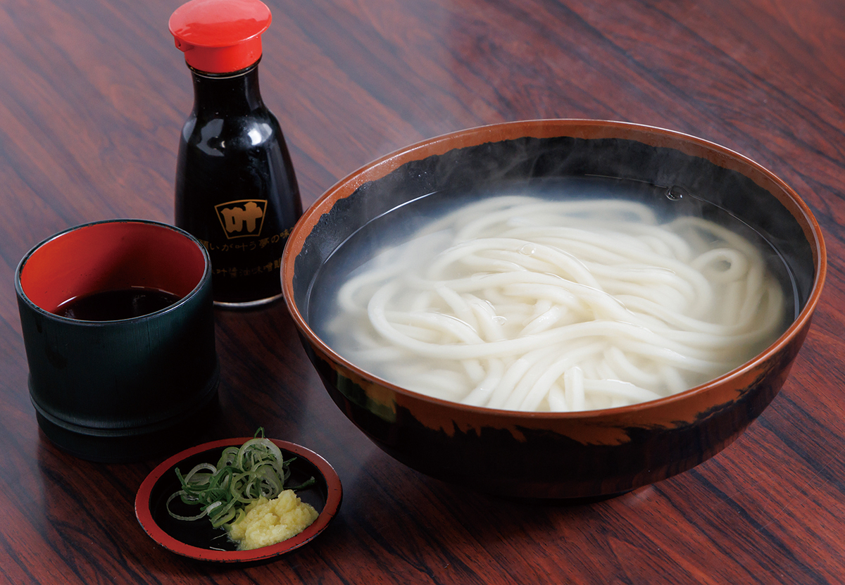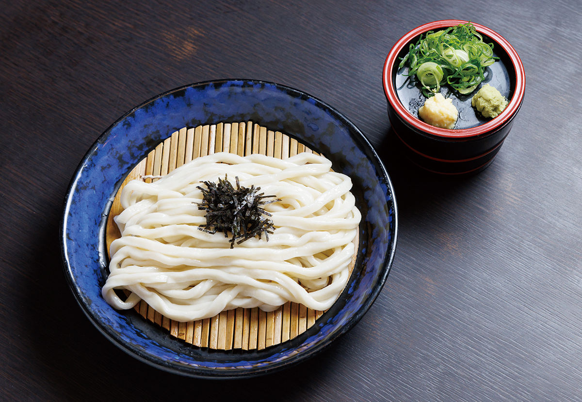 店名に由来する「タレつき 釜揚げうどん」は、自慢の麺のおいしさをダイレクトに味わえる一品。やわらかくも程よいもちもち感と小麦の香りを味わって。