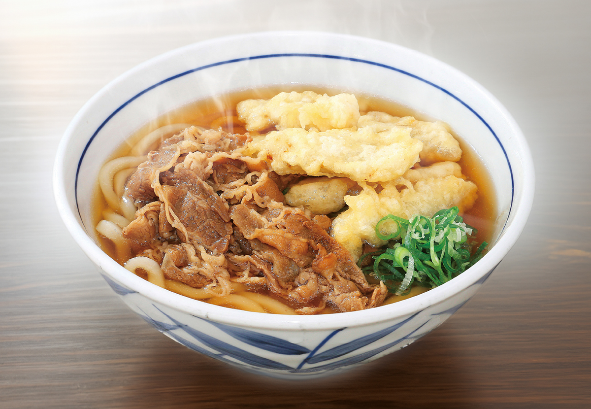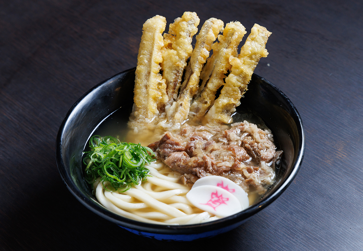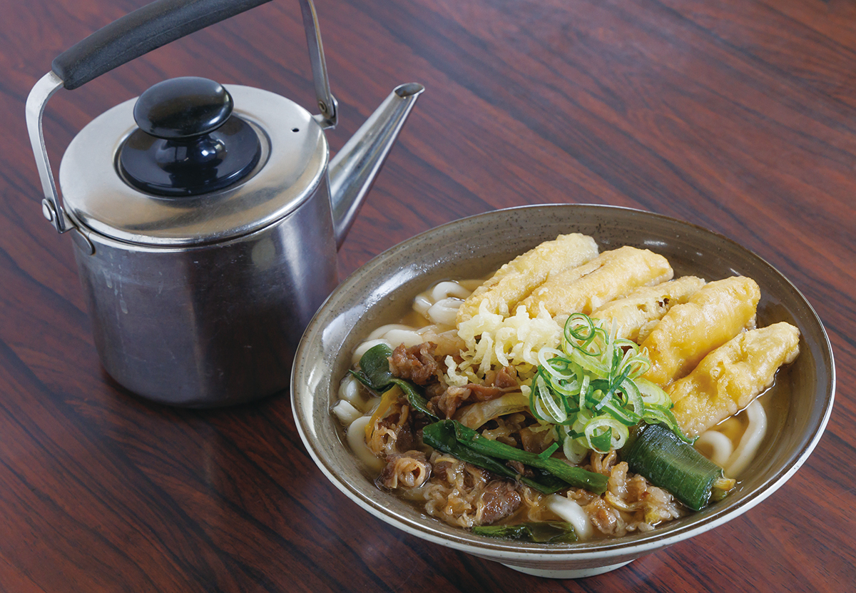 約30種類あるうどんメニューの中で人気No.1。甘く味付けした牛肉のうまみがだしに染み出し、おいしさが倍増。だしを吸ったごぼう天も美味。