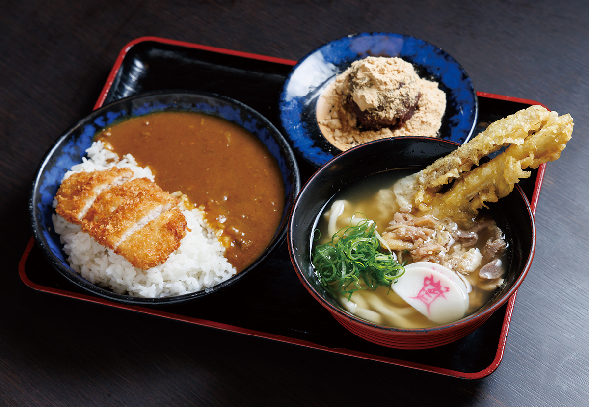 ミニサイズで、うどんも丼もぼた餅も味わえる大人気セット。ピリ辛のカツカレーやきなこぼた餅も選べて大満足♪