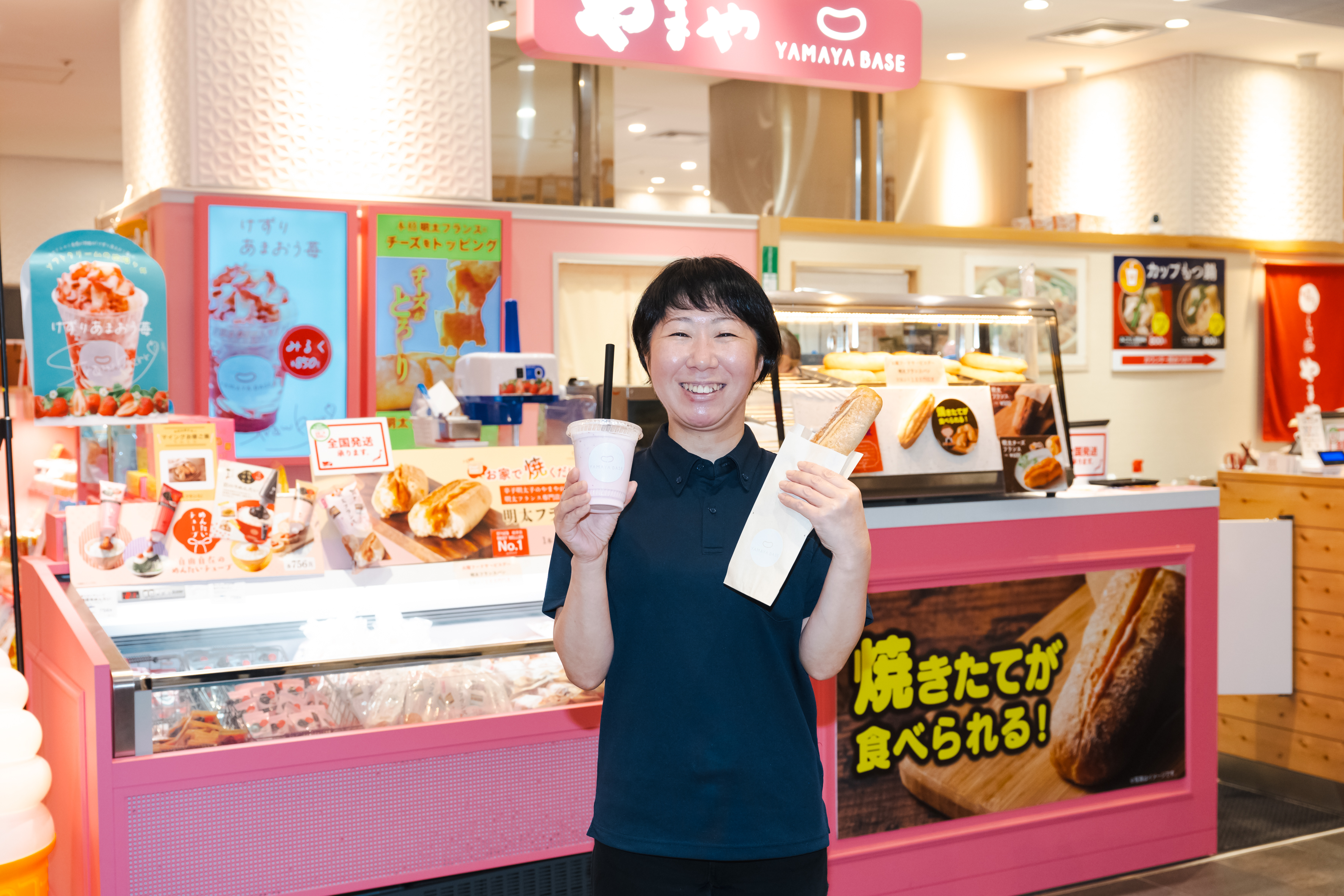 「YAMAYA BASE」の看板メニューは「やまや」が手がける焼きたての「明太フランス」。太宰府天満宮参道近くにある「YAMAYA BASE DAZAIFU」とJR博多駅構内のマイング店の2店舗があり、「明太フランス」や「めんたいチューブ」、「めんたいラスク」など「やまや」の人気商品を販売しています。