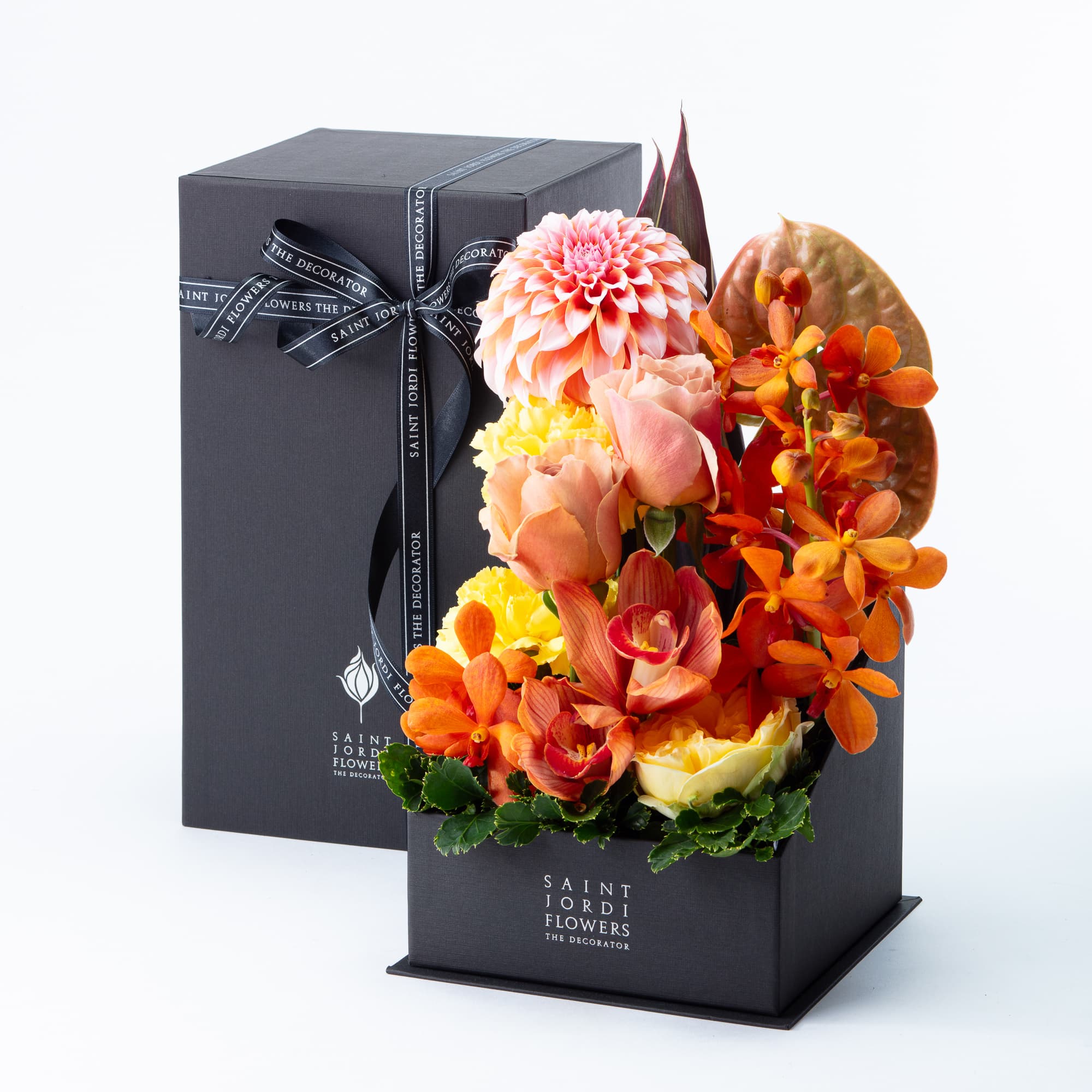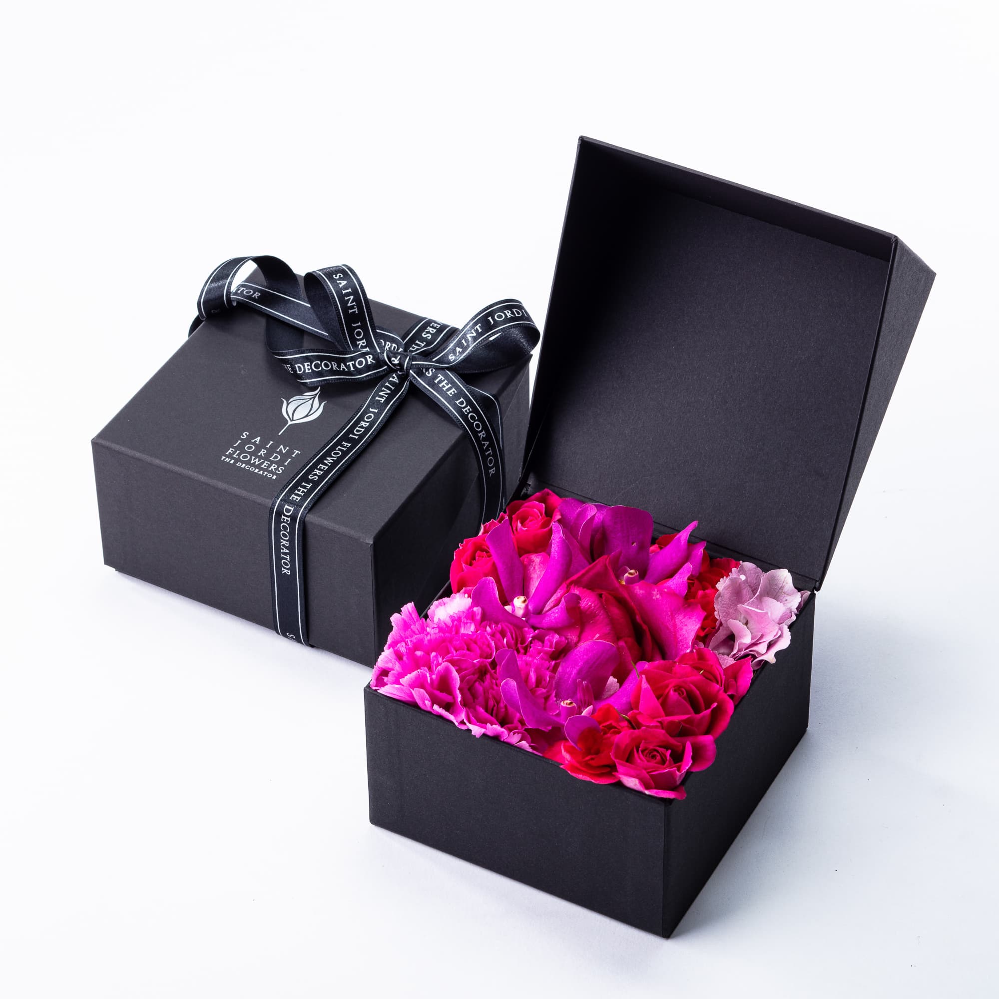 「Luxury Box(ラグジュアリーボックス)」は、ベルベット生地を使用したボックスに大輪の花を組み合わせたアレンジメント。W17.5×D17.5×H7.5cmで、価格は8,800円です。